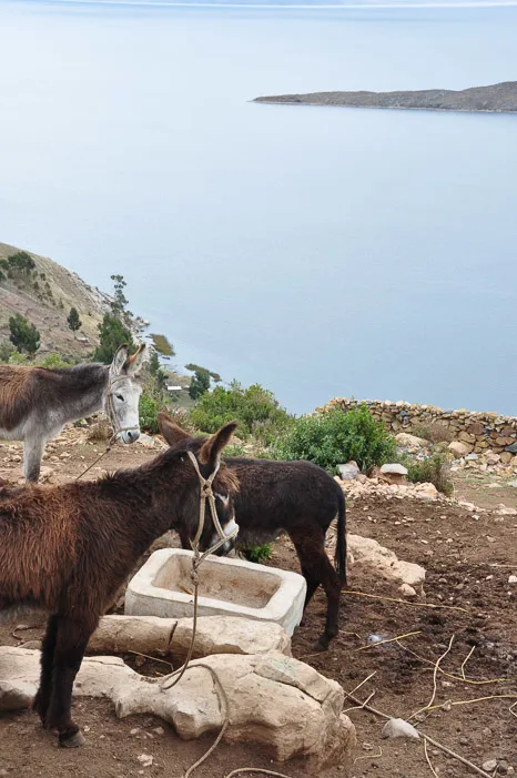 Die Hauptattraktion am südlichen Titicacasee ist die Sonneninsel. Nach Angaben der Inkas ist dort die Sonne geboren. Passenderweise hat es schon auf dem Hinweg in Strömen geregnet. Auf der Insel wird Ackerbau auf angelegten Terrassen betrieben. Überall stehen Esel herum.