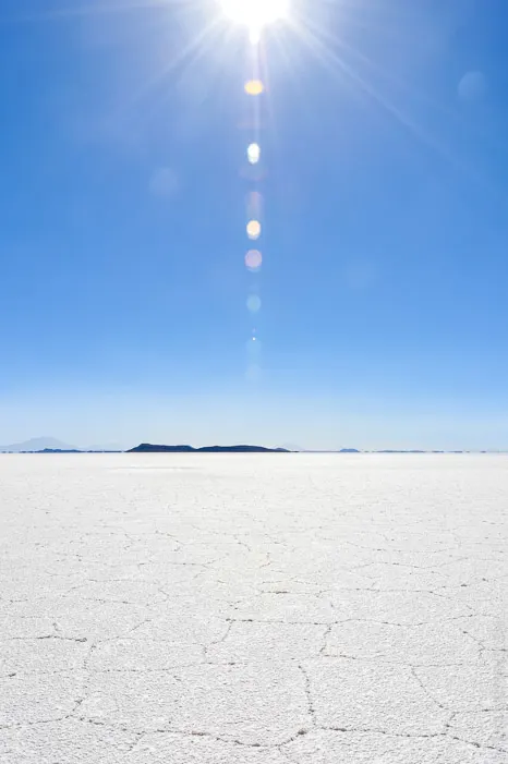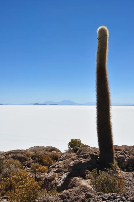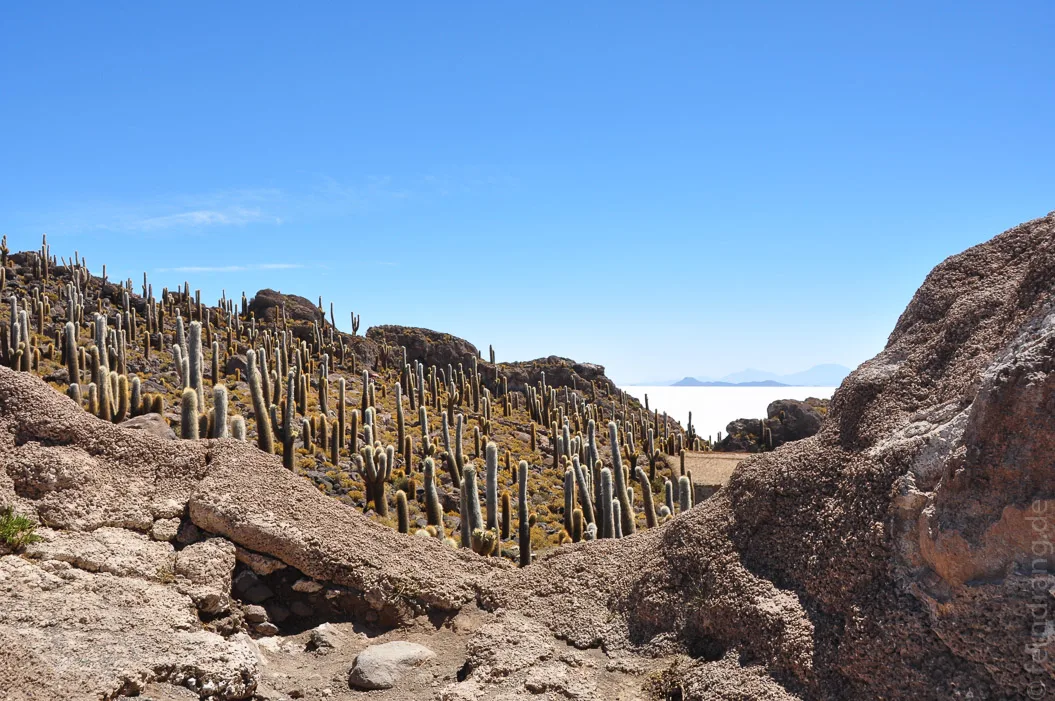 Mitten im Salz erhebt sich die Fischerinsel, die über und über mit Kakteen bewachsen ist, die mehr als 10m hoch werden. Rund herum reicht das Salz wie ein trockenes Meer an die Ufer der Insel.