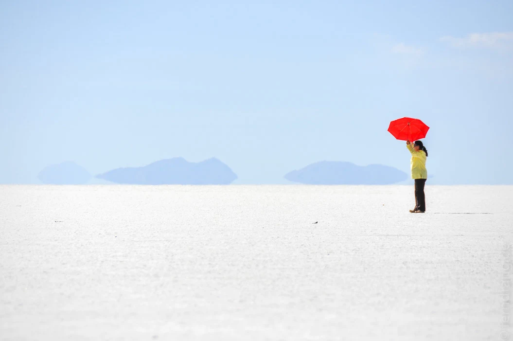 Unsere Gruppe bestand aus 4 weiteren Gästen (2x Bolivien, 1x Spanien, 1x Sachsen), einem Fahrer und einer lethargischen Köchin in einem dicken Jeep. Den Rest des Tages haben wir mit Fahrten durch den Salar de Uyuni verbracht. Die Salzwüste erstreckte sich zu allen Seiten bis zum Horizont, wo die umgebenden Berge durch Fata Morganas zu schweben schienen. Ein ganzer Tag lang nur überirdisches Weiß und Blau.