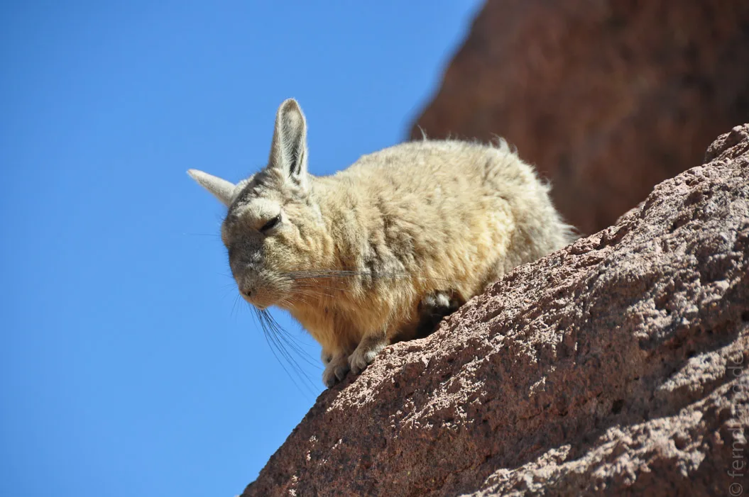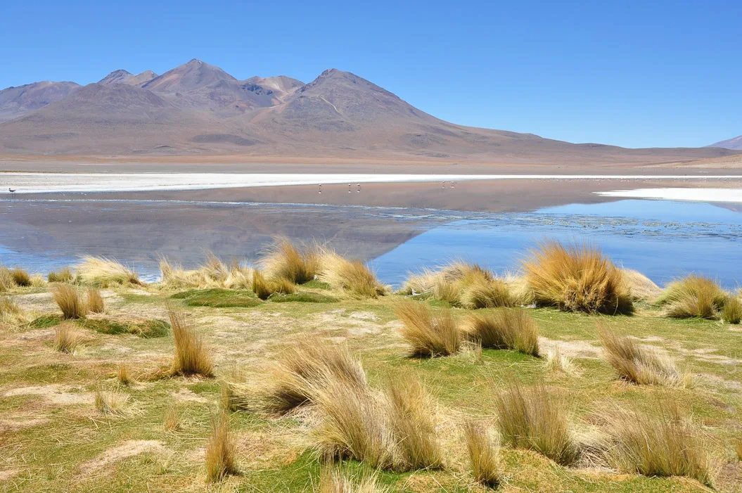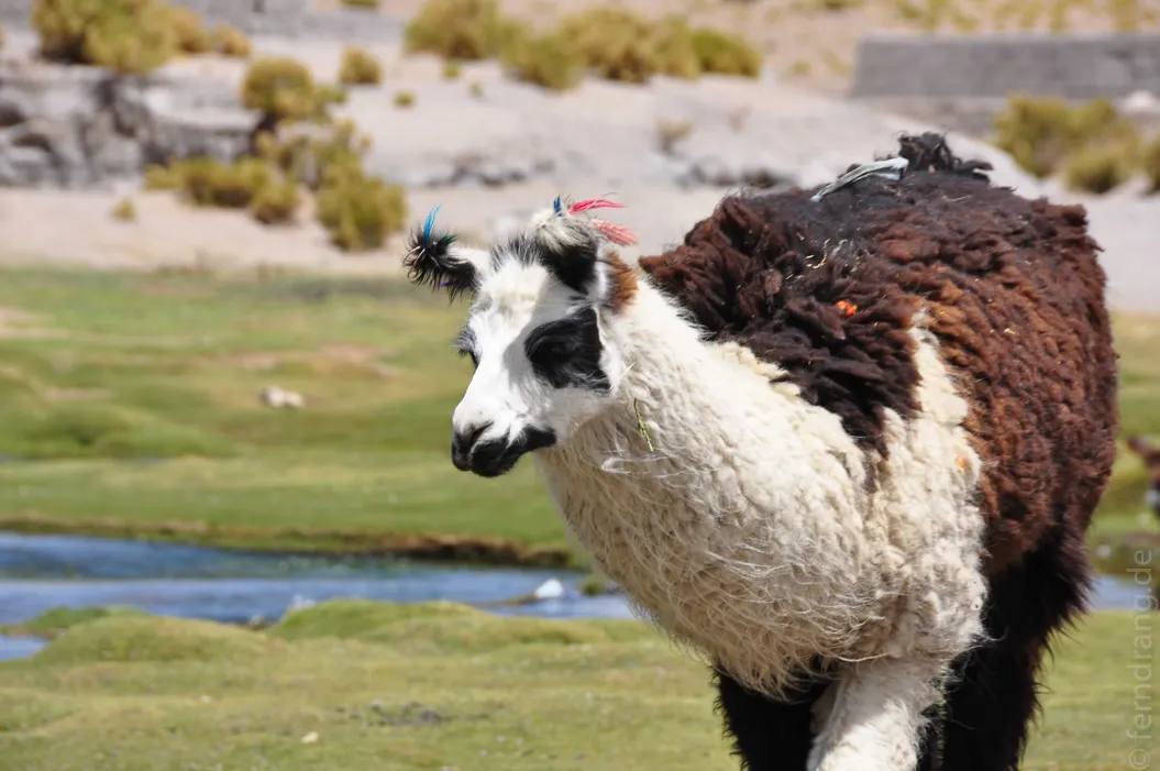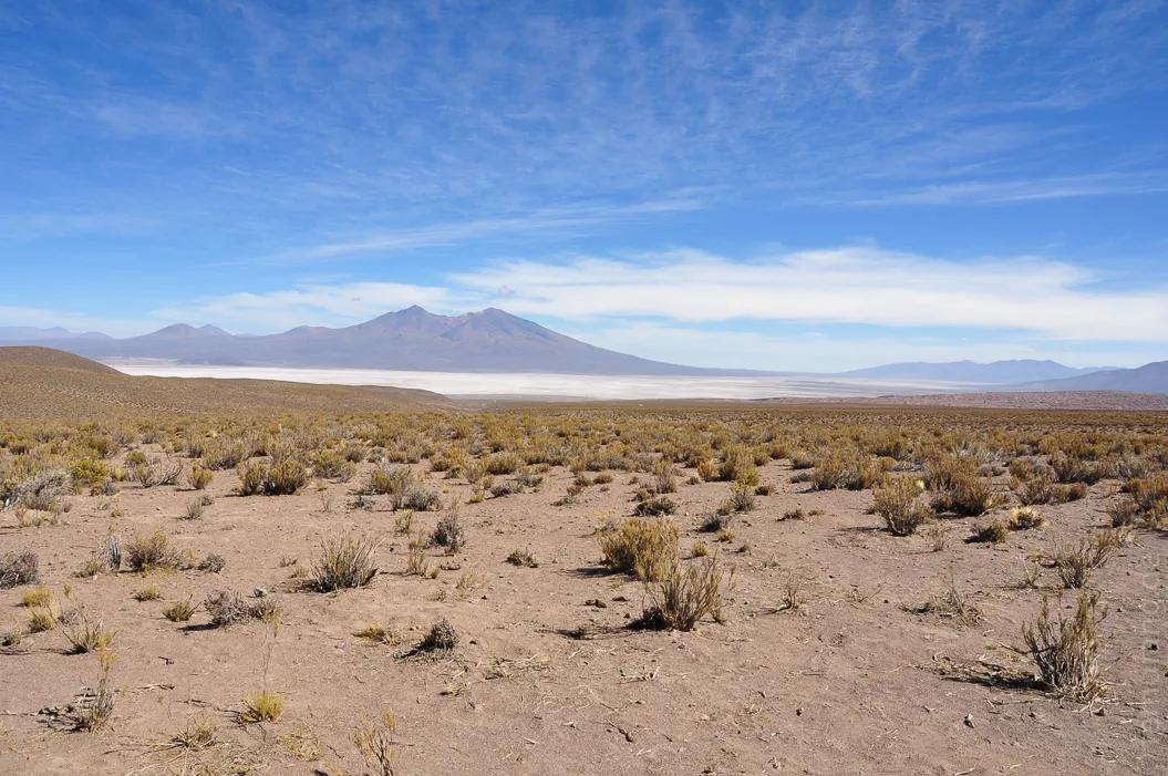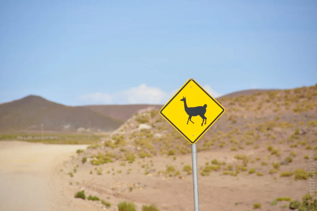 Der zweite Tag führte uns durch das bolivianische Hochland. Die Landschaft erinnert mit ihrer grandiosen und endlosen Kargheit stark an Tibet. Die steinige Einöde ist von verdörrten Grasbüscheln übersät. Sie dienen den Lamas und Vicuñas, die immer wieder vereinzelt in der Gegend herumstehen und Jeeps hinterher gucken, als Nahrung.