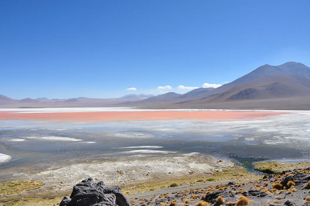 Obwohl mit dem Salar das Pflichtprogramm eigentlich schon abgehakt war, hatte das Hochland immer wieder tolle Überraschungen für uns parat. So zum Beispiel die Laguna Colorada, eine salzigweiß umrandete Lagune, die durch Mineralien blutrot gefärbt ist und sich mit pinken Flamingos schmückt.