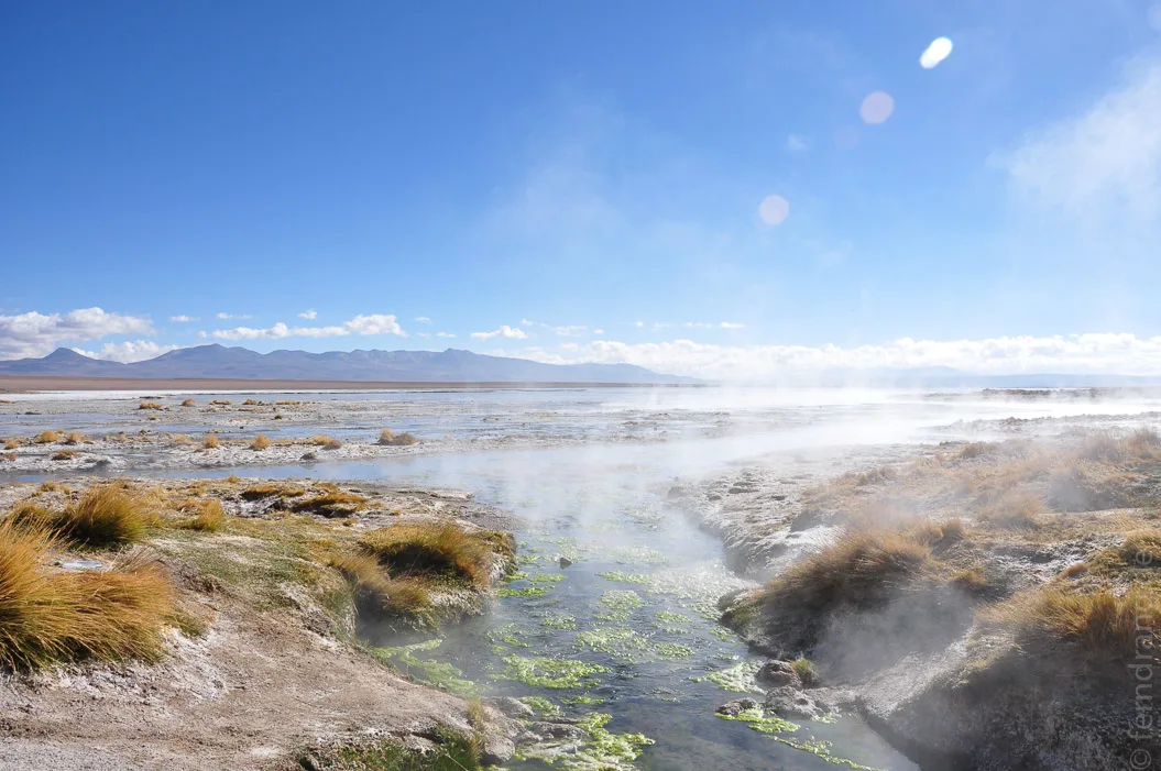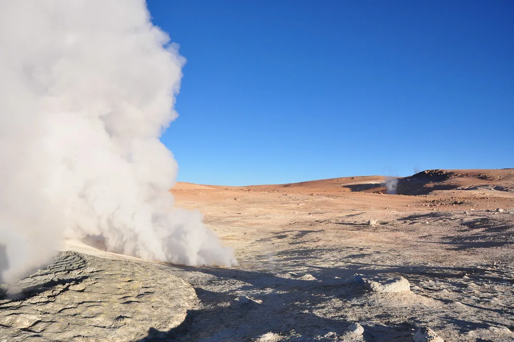 Der dritte Tag begann schon um vier Uhr morgens, damit wir pünktlich zum Sonnenaufgang an den Geysiren von “Sol de Mañana” sein konnten. Dort öffnet sich auf 4800m die Erde, um aus einer blubbernden, grauen Suppe heißen Dampf in die kalte Luft zu jagen. Ein vollkommen unwirklicher Ort, der sich in Duft fauler Eier hüllt.