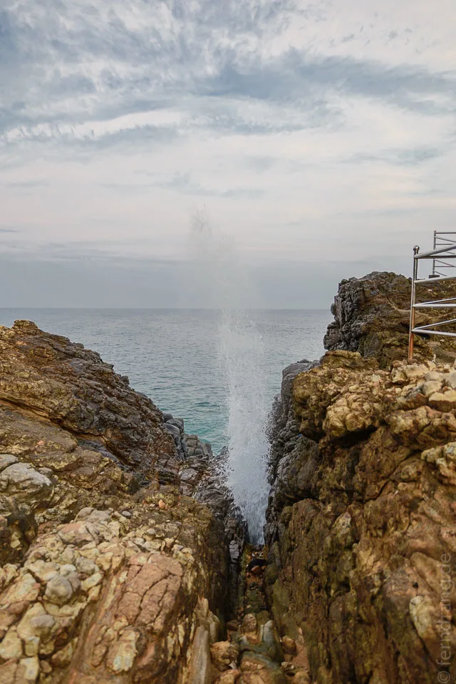 Auf dem Rückweg haben wir uns Dank Handy mit GPS-Karten durch winzige Wege durchs Nirgendwo zum “Blow Hole” an der Küste durchgeschlagen. Für dieses langweilige “Naturschauspiel” wird sogar horrender Eintritt verlangt. Aus einer Felsritze schießt ab und zu Wasser in die Höhe, das von den Wellen unterirdisch hochgepresst wird. Die Anwesenden waren wenig beeindruckt.