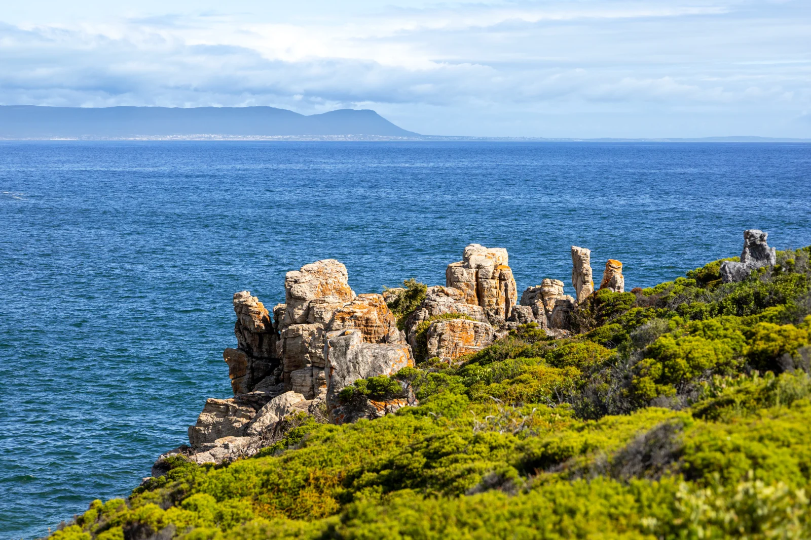 Später wird die Umgebung zwar ländlicher, aber nicht besonders aufregend. Unser nächster Stopp Hermanus kündigt sich als langgezogener Ort an der Schnellstraße an. Im Ortskern gibt es ausschließlich Touristen. Wären wir nicht eben noch in Kapstadt gewesen, hätten wir uns auf Sylt oder in Knogge vermutet. Nur unser schönes Hotel Auberge Burgundy sieht aus wie eine alte französische Villa, die sich verirrt hat.