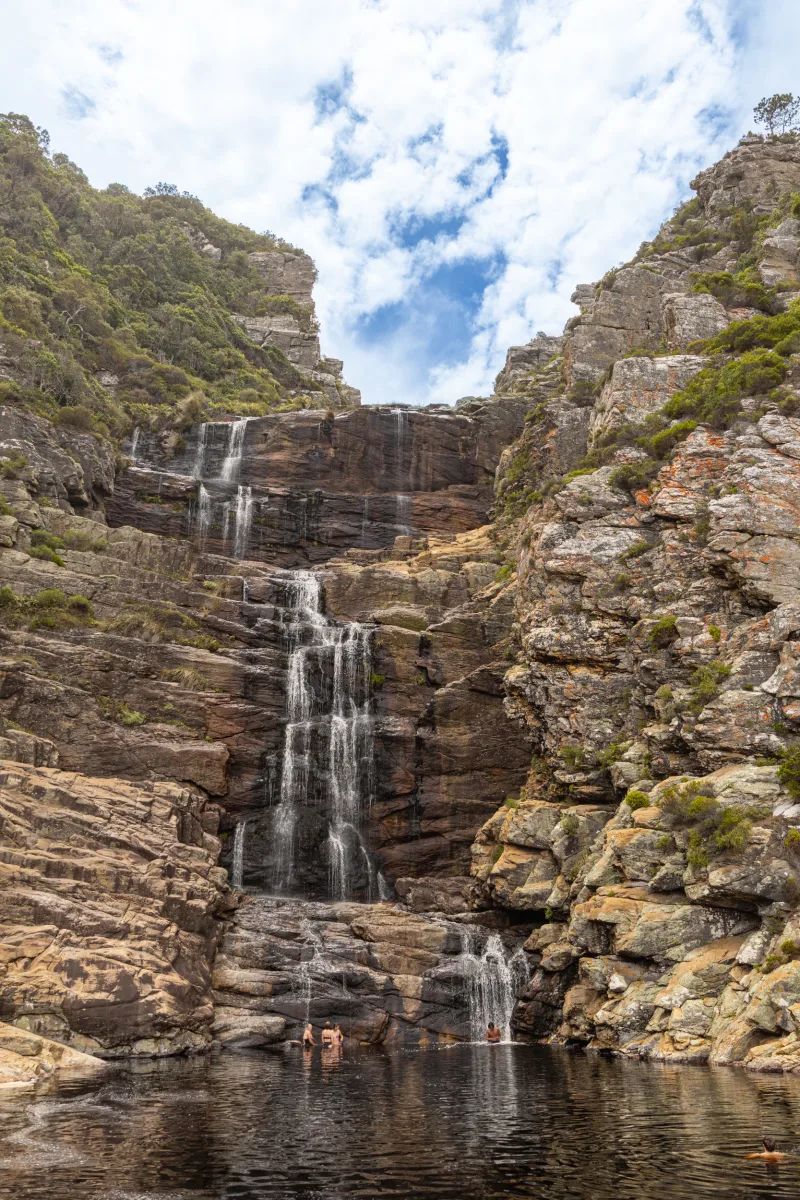 An der Küste gibt es einen schönen Wanderweg zu einem Wasserfall. Der Trampelpfad verliert sich nach einer Weile und es geht nur noch über große Steine am Strand entlang. Das Meer schleudert sich wild gegen die Küste. In dem eiskalten Pool des Wasserfalls konnten wir uns vor dem Rückweg etwas abkühlen.