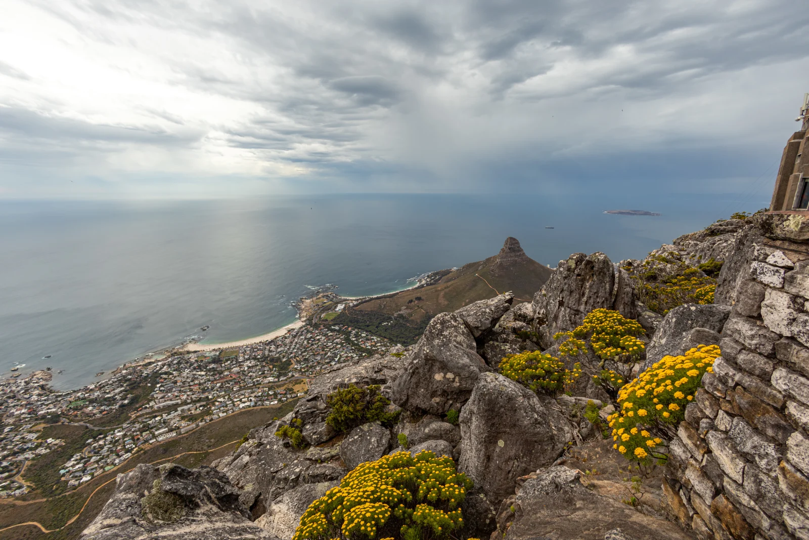 Der Blick auf die Innenstadt mit ihren hässlichen Hochhäusern erinnert an Bogota, wo man genauso vom Hausberg auf die endlose Stadt blickt. Aber in Kapstadt gibt es noch die andere Seite, wo die Bergkette der Zwölf Apostel majestätisch die Küste entlang Richtung Kap verläuft. Davor blenden weiße Sandstrände in den Buchten der schicken Vororte. Eine Wolkendecke legte sich sanft auf die Tafelberge und es wurde fast noch schöner dadurch. Fast, weil es dann anfing zu regnen.