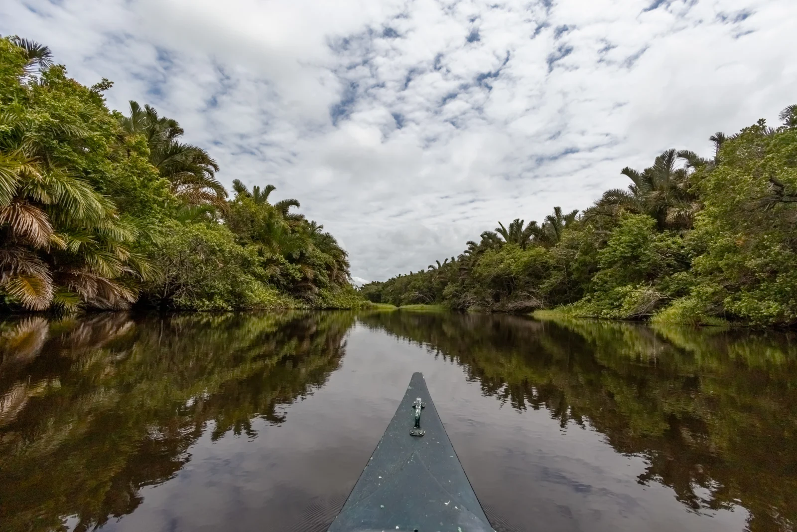 Zu den Aktivitäten, die im Kosi Forest geboten werden gehörte eine Kanufahrt in der Kosi Bay. Nach einer kurzen Fahrt mit dem Jeep hat uns ein Spaziergang durch einen schönen Wald mit vielen Farnen zu einem kleinen, zugewucherten Flüsschen geführt. Unser Guide hat uns in einem großen Kanu ein bisschen über den Fluss gerudert - für uns also eher eine Passivität. Am Ufer stehen viele baumartige Raphia Palmen, die mit ihren mächtigen Stämmen und riesigen Blättern eine undurchdringliche Mauer bilden. Viele Vögel warten auf den nächsten unvorsichtigen Fisch. Der Fluss verbindet ein System von mehreren Seen, die immer salziger werden und schließlich ins Meer münden. Mit dem Kanu kommt man leider nicht weit. Vor allem, weil die Seen voller Hippos sind, die man lieber in Ruhe lässt.