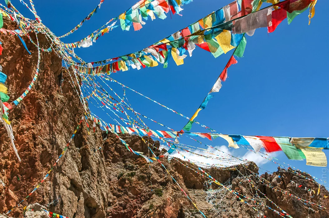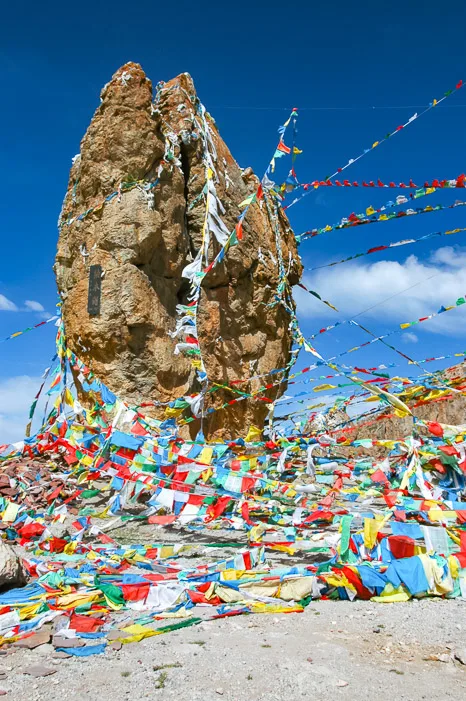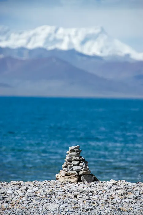 Der See gehört zu den drei (sehr) heiligen Seen Tibets. Daher wird der See auch nicht von Schiffen befahren oder gar zum Füßewaschen benutzt. Wir sind eine Weile das Ufer entlang gefahren, bis wir an einen Hügel kamen, der steil aus der flachen Ebene aufragte. Natürlich gibt es dort ein kleines Kloster, ein paar Stupas und jede Menge Gebetsfahnen.