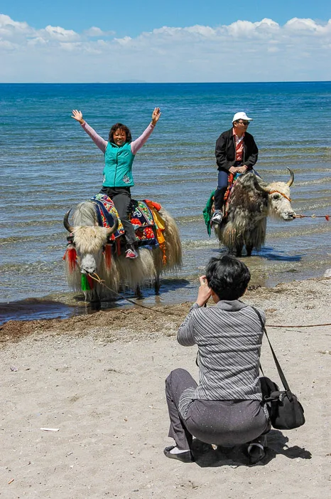 Auf dem Rückweg war das idyllische Ufer allerdings von einer großen Menschenmenge in Beschlag genommen. Beim Näherkommen konnten wir erkennen, dass Menschen auf Yaks einige Schritte ins Wasser ritten, um direkt wieder umzukehren. Als wir uns das Spektakel von Nahem angesehen haben, befanden wir uns in einer Unmenge chinesischer Touristen, die sich gegenseitig in den albernsten Posen fotografierten. Neben dem mutigen Ritt auf dem Yak waren Tai-Chi ähnliche Bewegungen sehr beliebt.