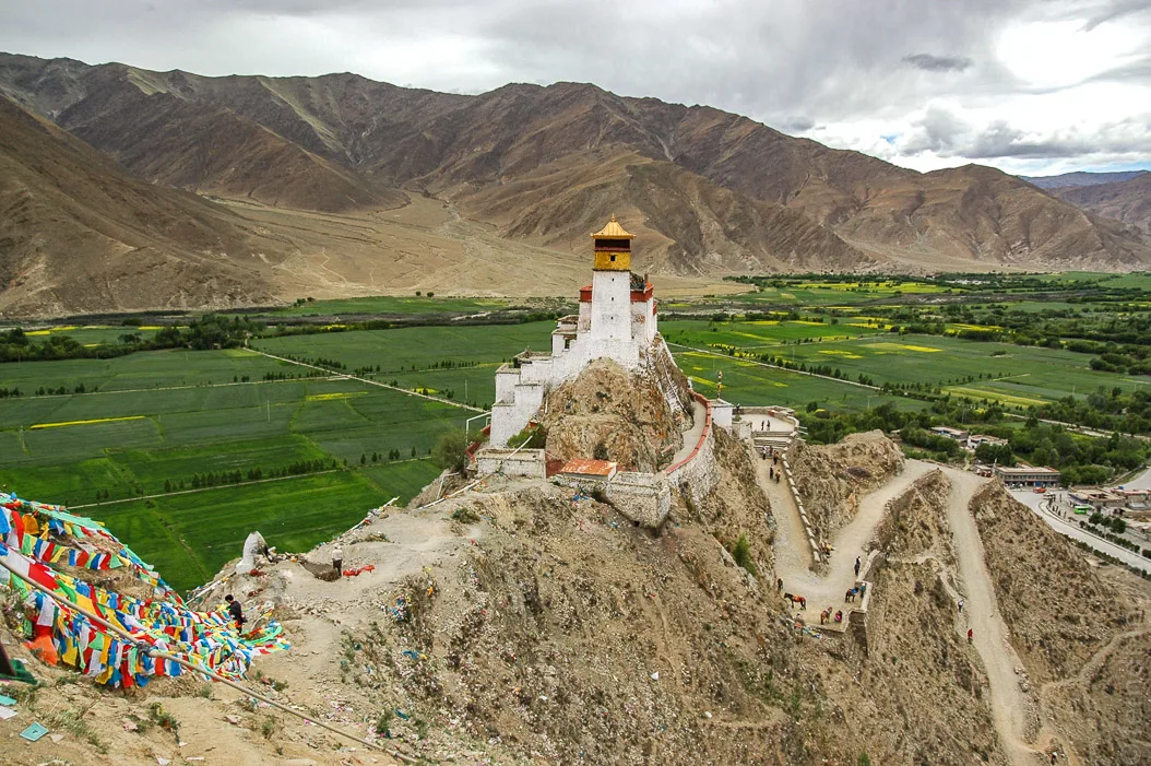 Die Rückfahrt ging schneller. Die nächste Station war der Yumbulagang - ein ehemaliger Königspalast. Er ist zwar sehr klein und geradezu bescheiden gebaut. Aber seine exponierte Lage auf einem spitzen Felsen lässt ihn von fruchtbaren Ebene aus darunter durchaus beeindruckend wirken. Im Palast wohnen nur wenige Mönche. Sie haben die ehrenvolle Aufgabe die heiligsten Schriftstücke Tibets zu bewachen, die hier teils vom Himmel gefallen sind und teils angefertigt wurden. Denn der Tempel ist auch die Geburtsstätte der tibetischen Schrift.