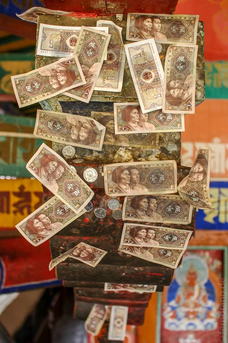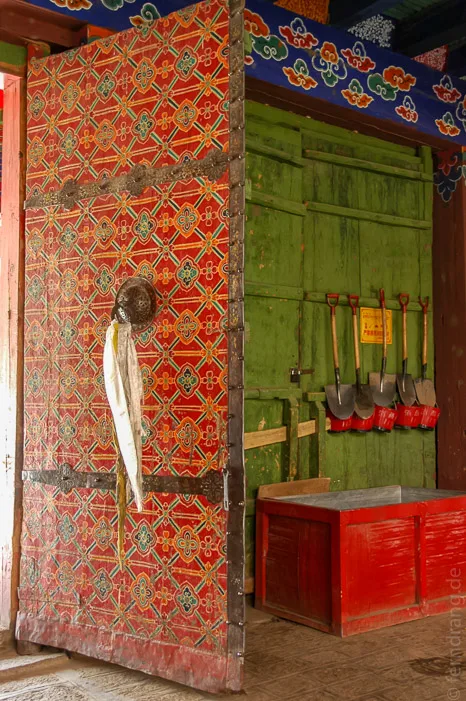 Auf dem Rückweg haben wir einen Abstecher zum Tandrok-Kloster gemacht. Das Kloster ist weniger spektakulär als die anderen beiden. Aber es ist auch eines der ältesten Tibets. Es beinhaltet neben dem üblichen Klosterinventar noch besonders riesige Gebetsmühlen, die man kaum alleine bewegen kann. Highlight im Dachgeschoss ist ein Bildnis einer Luxus-Göttin, das aus zigtausenden von Perlen hergestellt wurde.