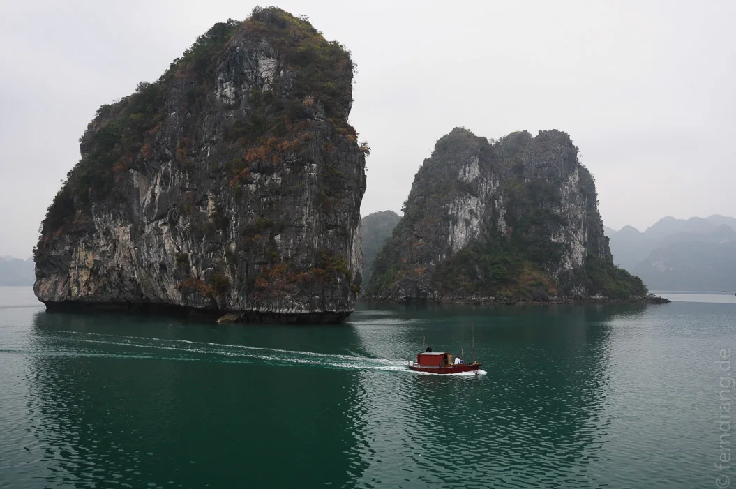 Vier Stunden östlich von Hanoi befindet sich die berühmte Halong Bucht. In dieser Ecke des Südchinesischen Meeres ragen überall Karstberge wie Pilze aus dem flachen Wasser. Das Wetter ist noch etwas kühler und noch viel nebliger als in Hanoi. Dadurch wirkt die Bootsfahrt durch die Bucht wie eine Fahrt durch eine chinesische Tuschezeichnung. Unwirklich tauchen die senkrechten Berge aus dem grünen Meer auf. Durch die ewigen Gezeiten sind sie unten ausgehölt und unterspült worden, was die Szenerie noch fragiler werden lässt.