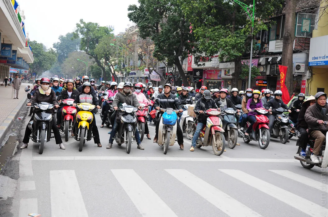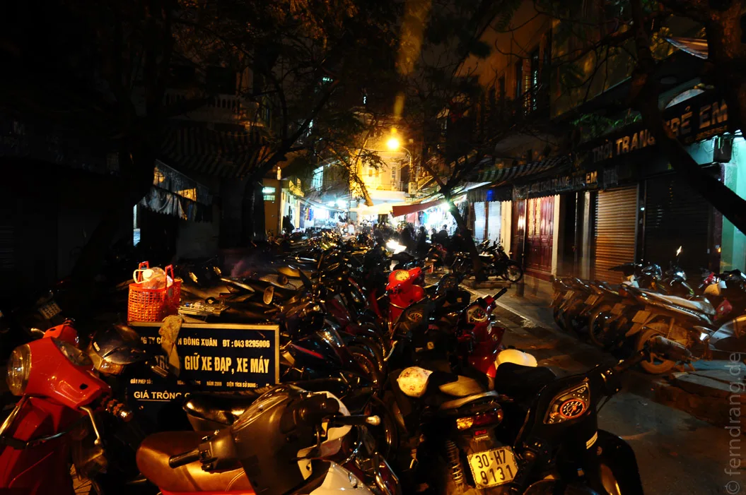 In der Altstadt werden die Straßen immer wuseliger und enger, bis nur noch Motorräder zwischen den am Straßenrand aufgebauten Garküchen und Verkaufsständen hindurch passen. Eine autofreie Zone ist in Hanoi aber nicht mit einer verkehrsberuhigten Zone zu verwechseln. Da hier auf zwei Einwohner ein Roller kommt, sind mit den paar Autos eigentlich nur Hindernisse für Rollerfahrer aus dem Weg geräumt. Blinker, Ampeln, Verkehrsschilder und das restliche Zubehör wird hier durch die Hupe ersetzt. Da hier niemand Freude an festen Regeln hat, kann man auch die größten und vollsten Straßen nach Wickert-Art überqueren, indem man sich einfach blind in den Rollerstrom stürzt und darauf vertraut, dass die Fahrer einem ausweichen - zögern ist gefährlicher.