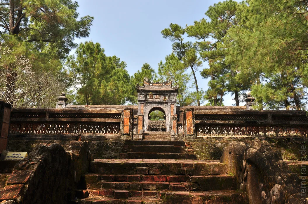 Die Kaiser haben sich nicht lumpen lassen, was ihre Ruhestätten anging. Mausoleum wäre stark untertrieben, um die prachtvollen Parkanlagen zu beschreiben. Insbesondere Tu Duc hat es ziemlich übertrieben. Das Ergebnis ist eine wundervoll angelegtes Kiefernwäldchen mit Seen, Inseln, Tempeln, Höfen und Pavillons, sowie eine Unzahl verschlissener Fronarbeiter, eine Verschwörung und ein ganzes Volk, das sich danach sehnt, das Grabmahl “in Funktion” zu sehen. Tatsächlich war das Gegenteil der Fall: Dem Kaiser hat es so gut gefallen, dass er sich mit seinen hundert Frauen plus (!) Konkubinen schon zu Lebzeiten gerne dort aufgehalten hat. Nach dem schönen Spaziergang für uns völlig nachvollziehbar.