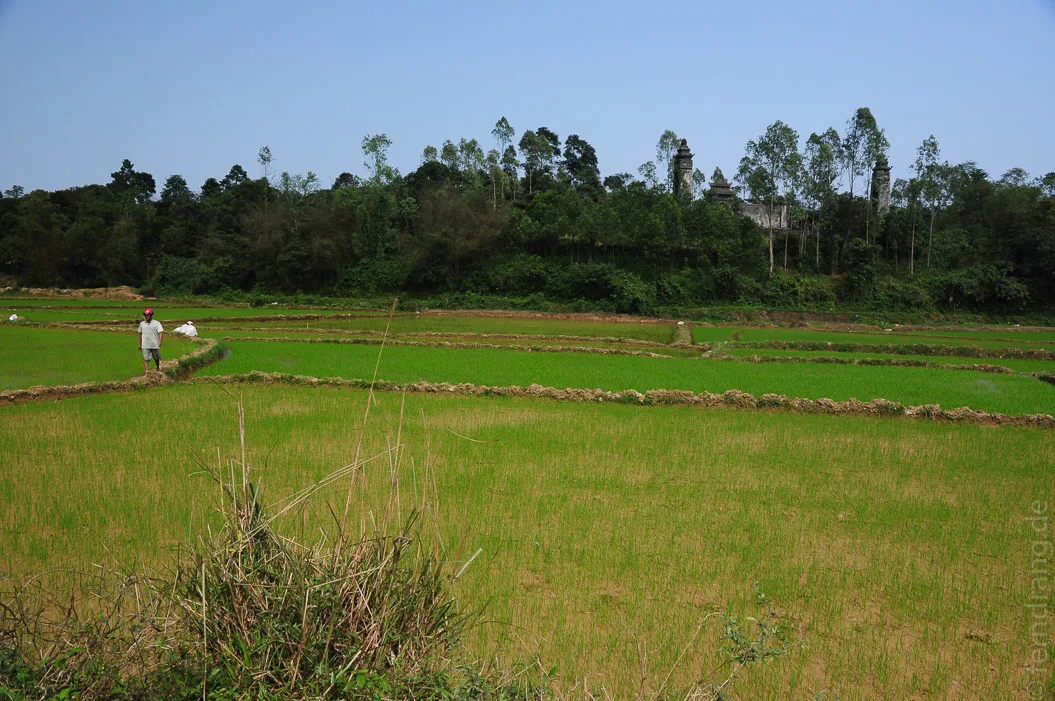 Angetrieben von wachsendem Enthusiasmus sowohl fürs Radfahren als auch für alte (Ho hi Minhs fällt also nicht darunter) Mega-Grabmäler haben wir unsere Räder durch Reisfelder, über Trampelpfade und zuletzt auch über eine Autobahnbrücke (auf der wir eine Fahrradkette neu aufziehen mussten) gescheucht. Die Gegend um Hue verbirgt wirklich einige Schätze in ihren Wäldern. Auf dem Rückweg haben wir sie aber im Verborgenen gelassen, weil wir inzwischen genug Pagoden für ein Leben gesehen haben.