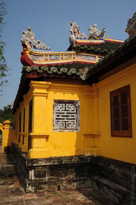Diese Stadt in der Stadt hat ihre eigene Mauer, weil hier Kaiser, Hofstaat und Konkubinen untergebracht waren. Von der im Krieg heiß umkämpften Festung ist dank fürsorglichem Bombardement beiderseits nicht viel übrig geblieben. Einige restaurierte Gebäude zeugen aber von beachtlicher Pracht. Die vielen symmetrischen Höfe, Tore, Pagodendächer und Zierteiche muten chinesisch an.