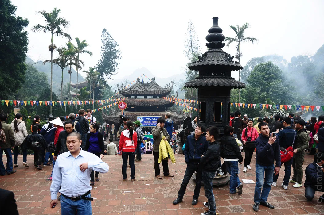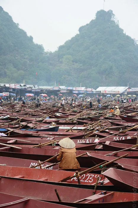 Unser Ausflug zur Parfum-Pagode ist zeitlich etwas ungünstig mit den Feierlichkeiten zum buddhistischen Neujahrsfest zusammengefallen. Dass die Fahrt im Ruderboot entlang der kleinen Karstberge nicht unbedingt idyllisch werden würde, war uns klar. Dass man den Fluss unter den hunderten von Booten aber kaum noch sehen konnte, hätten wir nicht erwartet. Da wir ausgerechnet sonntags gefahren sind, sind wir auf zigtausende Pilger gestoßen, die ihren Segen erneuern wollten. Das gesamte Areal war ein einziges Volksfest. Unter den ganzen Pilgern war unsere Handvoll Touristen allerdings die Hauptattraktion.