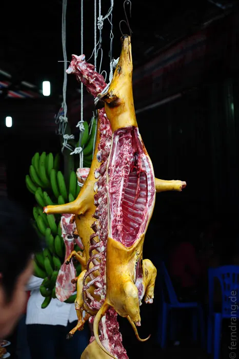 Die Wanderung auf den “Berg der duftenden Spuren” hat sich als Spießrutenlauf durch eine endlose Kette von Verkaufsständen erwiesen. Da der Weg mit Wellblech überdacht war, konnte man die hübschen, nebligen Hügel noch nicht mal erahnen. Auf halbem Weg nach oben wurde die Menschenmenge so dicht, dass es kein Fortkommen mehr gab. Uns lief die vom verpeilten Führer zu knapp bemessene Zeit weg. Daher mussten wir nach einer Viertelstunde Stillstand in einem Block drängelnder Vietnamesen umkehren, ohne auch nur einen Blick auf die Parfum-Pagode werfen zu können.